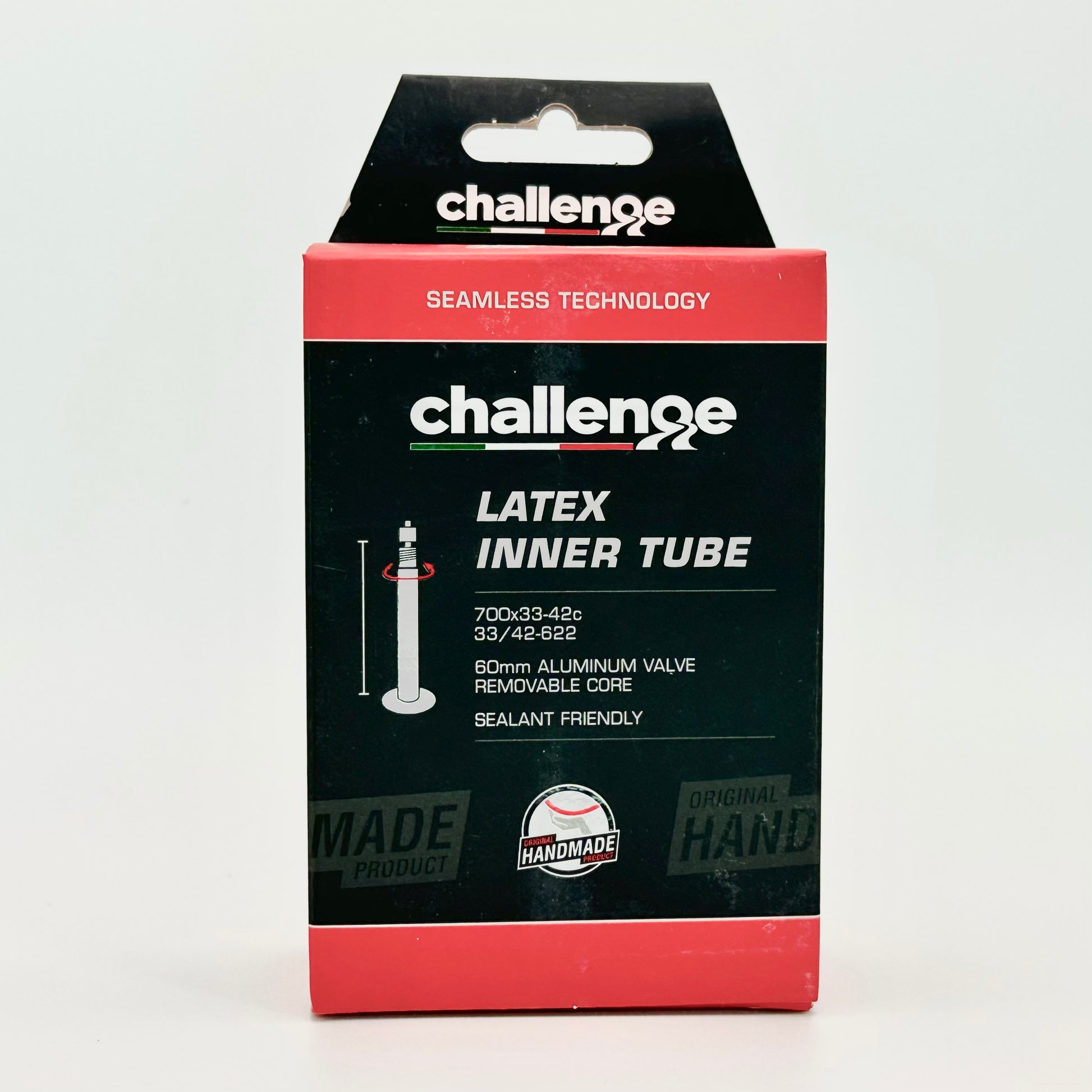 Handmade lightweight seamless Latex Inner Tube made by Challenge. This is a must for anyone wanting the best rolling setup without using tubeless. 700x33-42c in size with a 60mm valve length. Removeable core to allow the use of valve extenders is needed.
